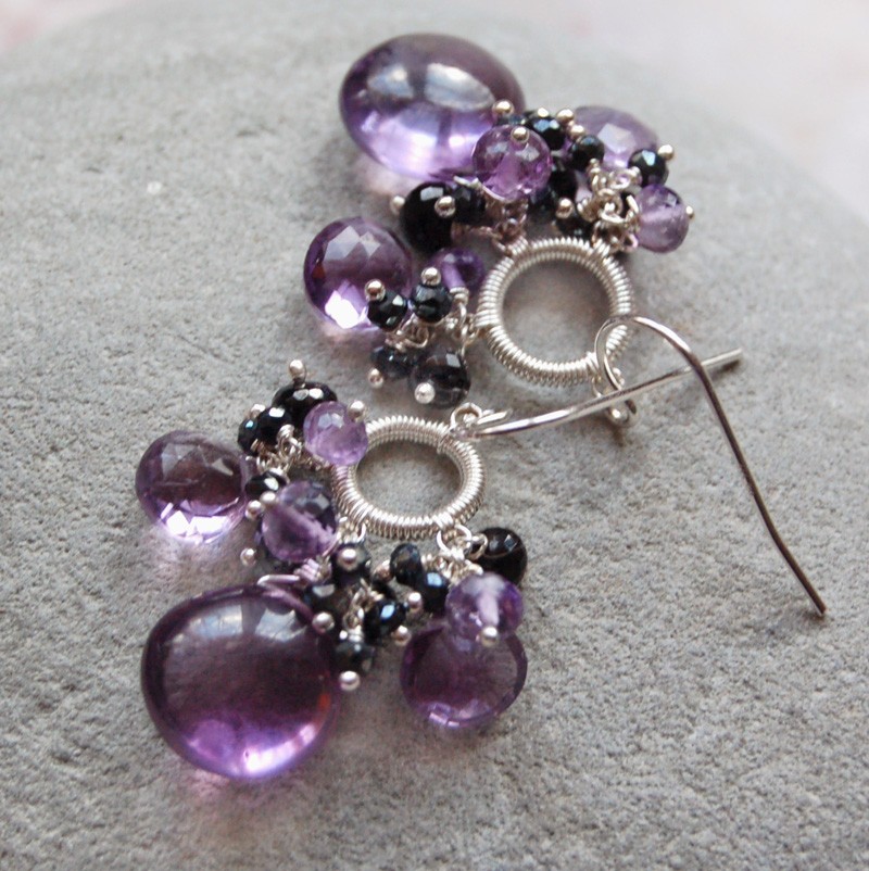I have fallen in Love with these "Parfum de Violette Earrings" by the very talented modesteparisienne!!!"These little beauties showcase trios of polished and faceted purple Amethyst briolettes. Each has been adorned with sprays of tiny faceted Mystic Black Spinel rondelles, exquisitely faceted Black Spinel and purple amethyst rondelles. All the high grade gemstones are attached to small, meticulously wire wrapped Sterling frames."