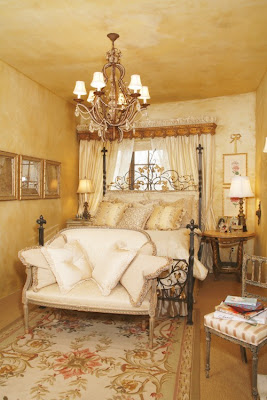 I found the Bathroom from the Blog "French Country Cottage". The Bedroom came from the Home Design Blog "Houzz". I could not track down the location of the living room.