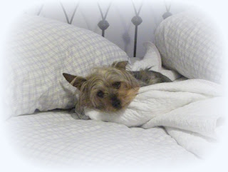 This morning I guess her busy schedule of chasing butterflies, stealing socks, and playing with her toys finally caught up with her.  She decided to sleep in.....lol!