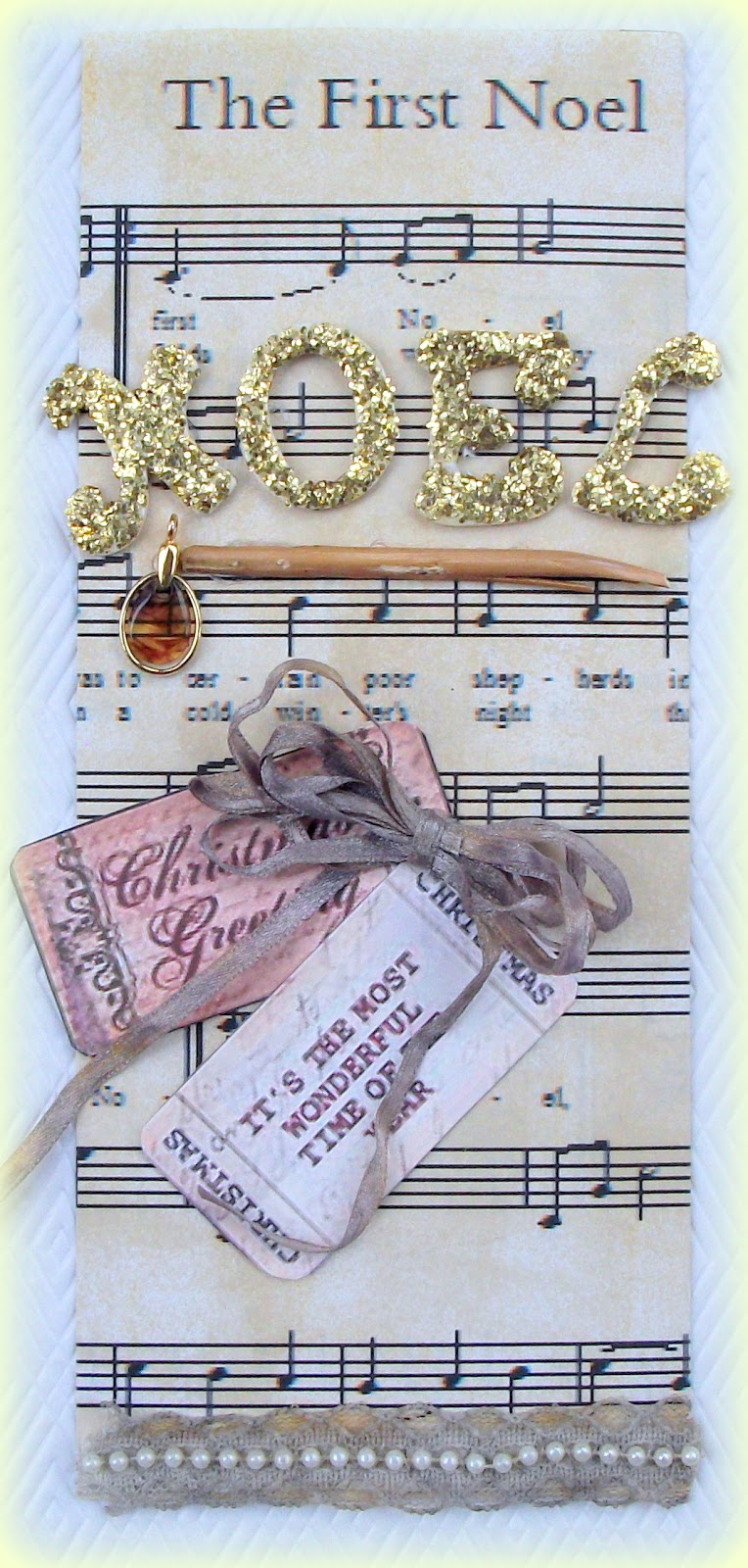 I used a jumbo rectangle tag I picked up at Michaels and "Wrapped" it with music of the Christmas Song "The First Noel" on white cardstock paper.