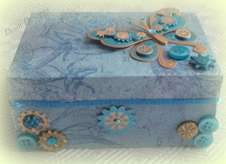I used 3D stickers of butterflies and a few buttons to jazz it up a bit. I then added one of the 3D Butterflies on the inside. I also glued a little blue trim around the edge.