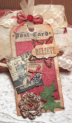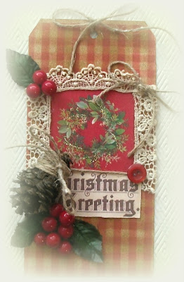 I love the warm Victorian country feel of your tag, Tracie! The gingham is perfect and your vintage wreath image is beautiful. The lace is looks wonderful and the pinecone and holly are the perfect finishers. So great to see another tag from you in this challenge. Hope to see more!