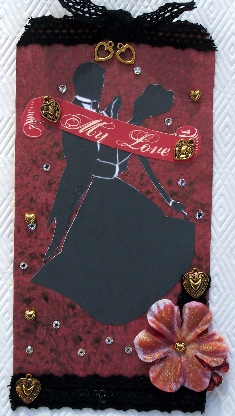I added my Silhouette of a couple dancing, and embellished the tag with black lace, card stock expression "My Love", Swarovski crystals, various Heart Charms and a flower with red and gold glitter.